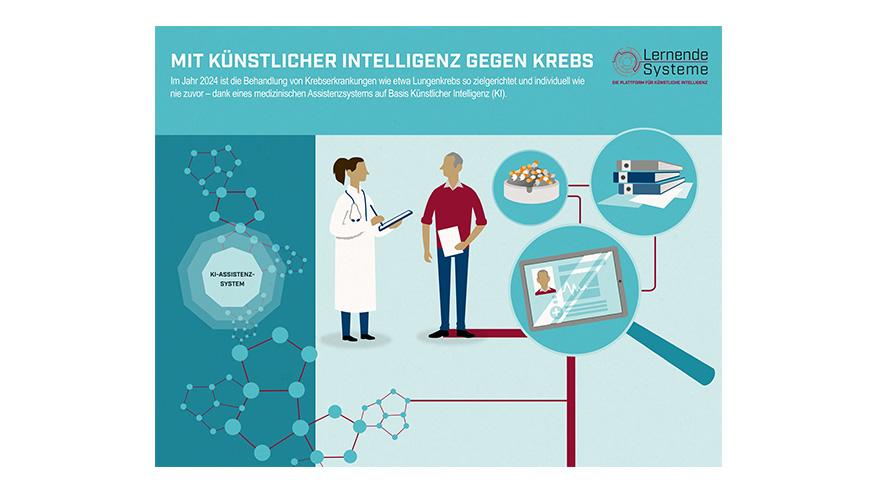 Im Zentrum des Anwendungsszenarios “Mit Künstlicher Intelligenz gegen Krebs“, das die Arbeitsgruppe Gesundheit, Medizintechnik, Pflege der Plattform Lernende Systeme erarbeitet hat, steht ein KI-basiertes Assistenzsystem, welches in rund fünf Jahren Ärztinnen und Ärzte bei ihrer Entscheidungsfindung unterstützt. Über eine Datenplattform werden das umfangreiche medizinische Wissen, neueste Leitlinien und weltweite, anonymisierte Patientendaten miteinander verknüpft. Auch die individuellen Daten eines Patienten fließen auf dessen Wunsch in die Plattform ein. Künstliche Intelligenz ermöglicht es, die riesigen Mengen an Versorgungsdaten und den stark wachsenden Wissensschatz auszuwerten und zu analysieren. Mithilfe der Ergebnisse können Ärztinnen und Ärzte ihre Patienten maßgeschneidert beraten und Prävention, Früherkennung und Behandlung von Lungenkrebs verbessern.