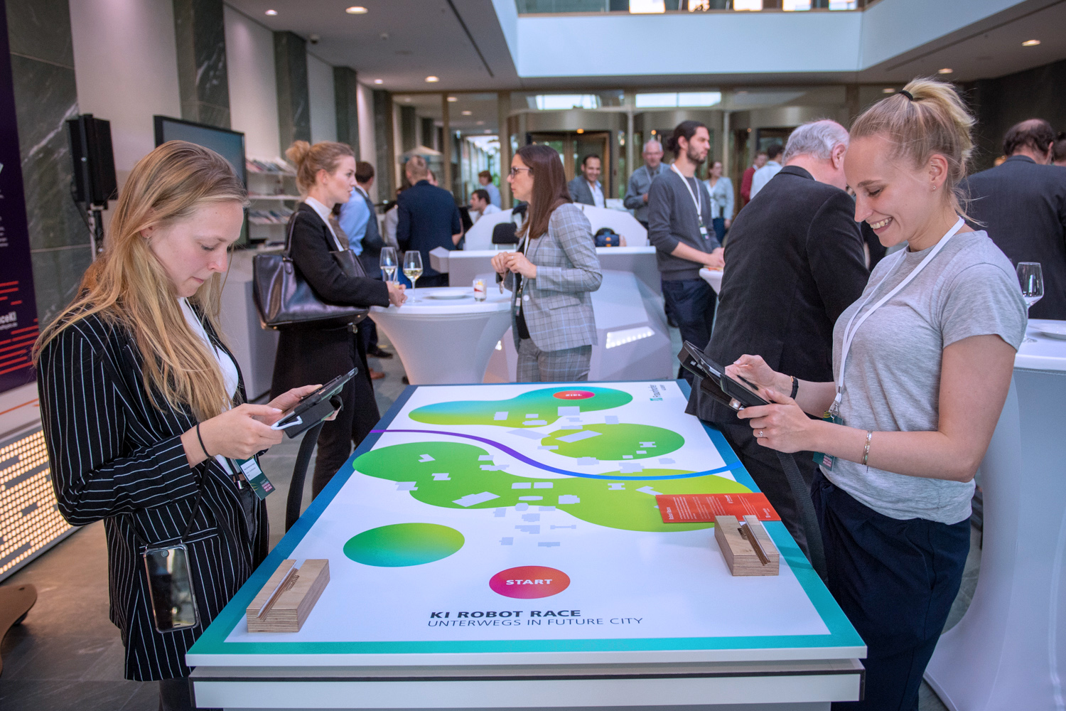 Im „Robot Race“ der Fraunhofer Academy treffen die zwei Avatare „Josie“ und „Joe“ zu einem virtuellen Rennen an. Die Figuren werden dabei per iPads gesteuert. Das Ziel: So schnell wie möglich zur Fraunhofer Academy zu gelangen und auf dem Weg dorthin fünf Aufgaben zu meistern, die schon heute im (Arbeits-)Alltag oft durch eine KI erledigt werden.