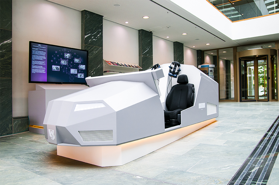 Auch beim autonomen Fahren spielt KI eine große Rolle – und auch für dieses Thema hält die Foyerausstellung ein Exponat bereit: Besucherinnen und Besucher der Ausstellung können in einem Automodell der Universität Osnabrück und der Deutschen Forschungsgemeinschaft Platz nehmen, mittels Virtual-Reality-Brille das autonome Fahren selbst erleben – und so eventuelle Bedenken zu diesem Thema aus dem Weg zu räumen. Bei der Fahrt durch eine virtuelle Stadt werden Blicke und Kommentare der Fahrerin bzw. des Fahrers aufgezeichnet und daraus Erkenntnisse gewonnen, die dabei helfen sollen, KI transparenter und sicherer zu machen.