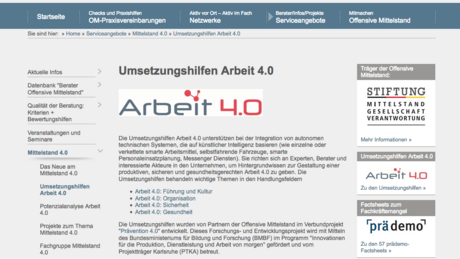 Ob die Benennung von Datenschutzbeauftragten, der Abschluss einer Betriebsvereinbarung zu Datensicherheit, Weiterbildung oder Regeln zum Umgang mit Crowdworking: Die insgesamt 79 Umsetzungshilfen geben Empfehlungen zu allen wichtigen Themen der Betriebsführung im Mittelstand.