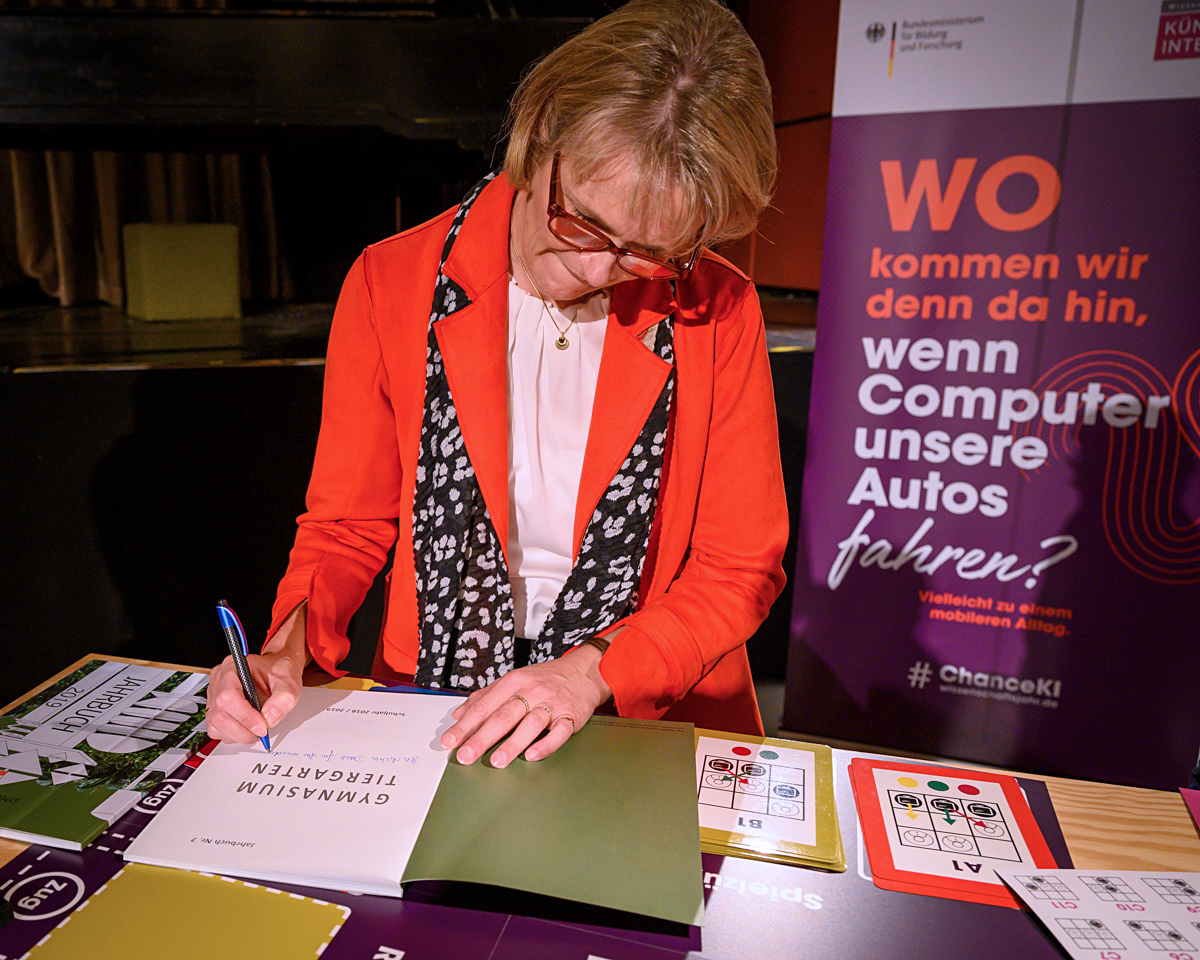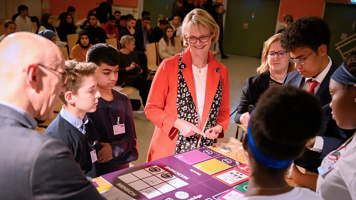 Im Rahmen eines Pressegesprächs anlässlich der Vorstellung der Jugendaktion betonte Bundesbildungsministerin Anja Karliczek: „In unserer immer digitaler werdenden Welt ist Künstliche Intelligenz eine Zukunftstechnologie. Daher ist es wichtig, schon Kindern und Jugendlichen KI nicht nur zu erklären, sondern sie auch dafür zu begeistern. Das gelingt mit dem Spiel „Mensch, Maschine!“ ganz hervorragend. Das Brettspiel ermöglicht es – gerade aufgrund seiner analogen Form – das hochkomplexe Maschinelle Lernen verständlich darzustellen. Wir werden daher 150 weitere Klassensätze produzieren lassen, damit mehr Schulen in Deutschland von diesem Angebot profitieren können. Denn klar ist, dass man sich an den Schulen fächerübergreifend mit KI beschäftigen muss.“