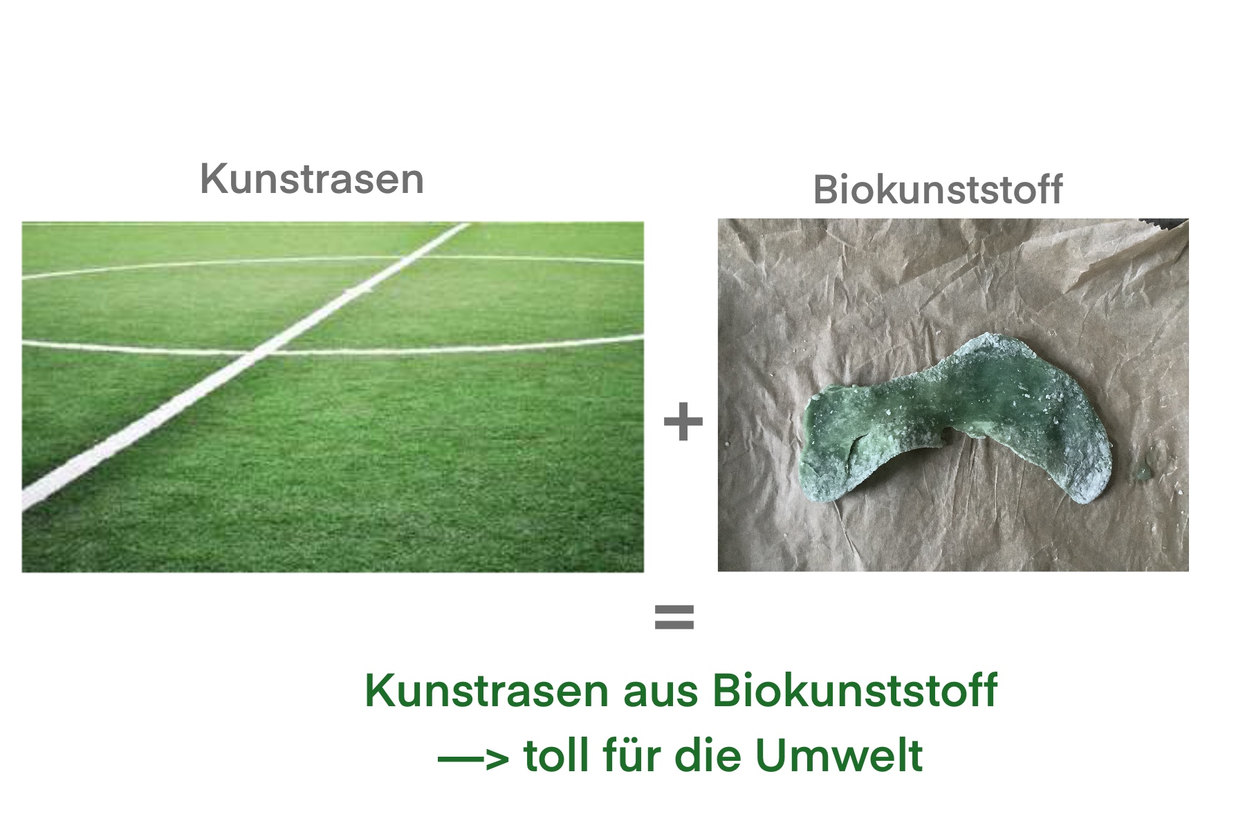 Ich spiele Fußball und mein Verein bekommt diesen Sommer einen Kunstrasenplatz. Herkömmlicher Kunstrasen wird aus konventionellen Kunststoffen hergestellt, die der Umwelt extrem schaden, aufgrund des Abbaus der Rohstoffe, zudem werden beim Einschmelzen des Platzes, nach seinem Gebrauch, Schadstoffe in die Umwelt ausgestoßen, die den Klimawandel beschleunigen. Meine Idee die Welt etwas besser zu machen ist daher, einen Kunstrasen aus einem Biokunststoff herzustellen, der biologisch abbaubar und aus nachwachsenden Rohstoffen besteht. Als Beispiel kann ein Kunstoff aus Kartoffelstärke und Glycerin sein.