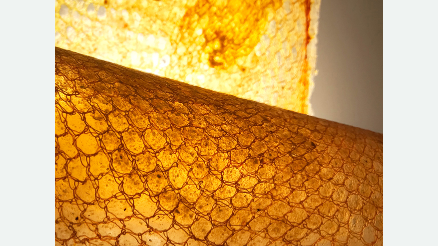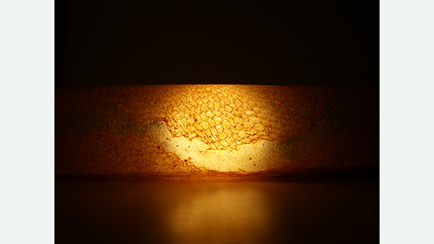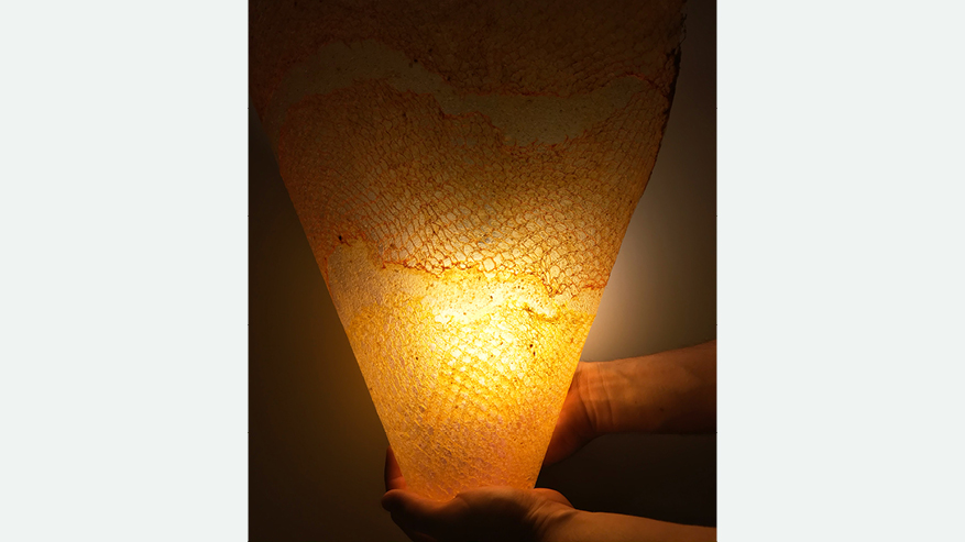 Dieses Lichtobjekt besteht aus Bioplastik, welches auf getrockneter und gemahlener Orangenschale basiert. In das Material sind Orangen-Baumwoll-Tragenetze eingearbeitet. Somit werden alle Teile der Orange inklusive der Verpackung weiterverarbeitet. Die Orangenschalen sorgen für die intensive Farbe und versprühen ein warmes, atmosphärisches Licht. Die Netze erzeugen eine interessante Fischhaut-ähnliche Schuppenstruktur.