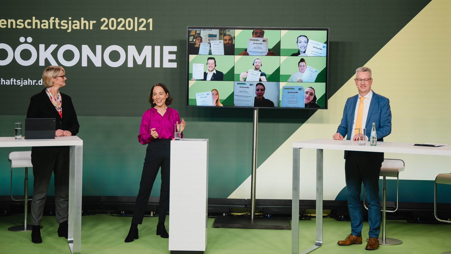 Die fünf gelungensten aus den insgesamt 25 Gewinnerteams des Hochschulwettbewerbs 2020/2021 wurden auf der Abschlussveranstaltung zum Wissenschaftsjahr von Bundesforschungsministerin Anja Karliczek und Prof. Dr. Günter M. Ziegler, Vorsitzender des Lenkungsausschusses von Wissenschaft im Dialog (WiD), besonders hervorgehoben.