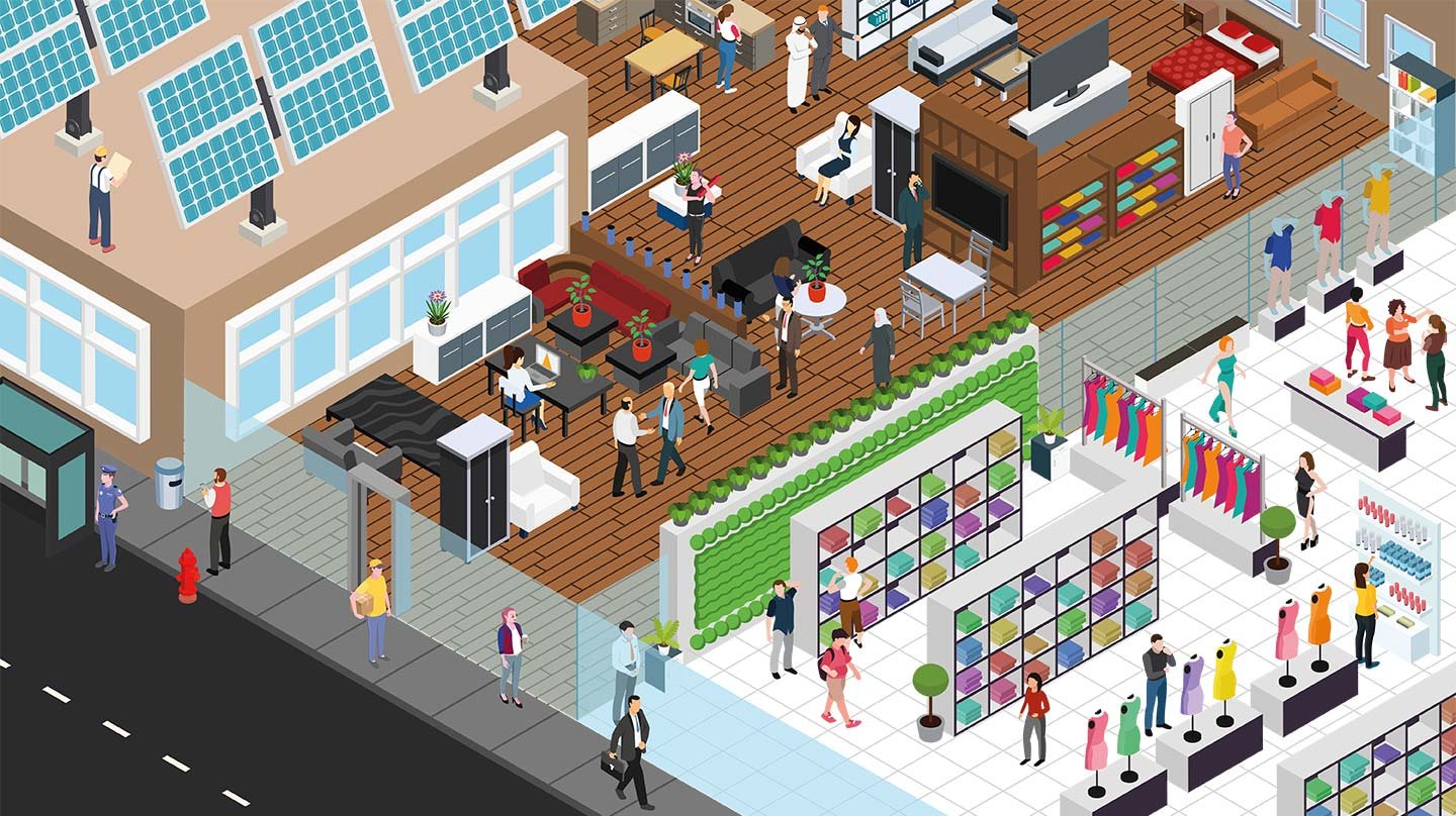 Gehen Sie in unserem Wimmelbild auf Entdeckungsreise und finden Sie innovative Produkte, zukunftsfähige Berufe und umweltschonende Produktionsverfahren.
