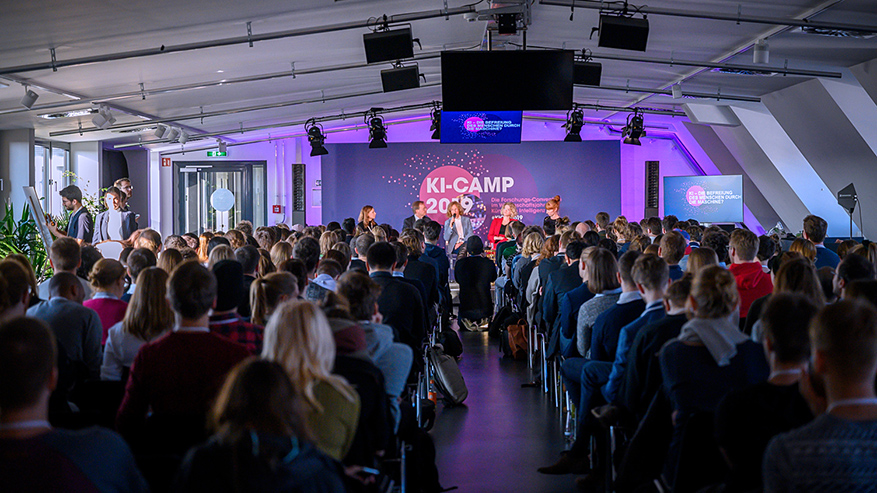 In der Factory Berlin trafen beim KI-Camp, der ersten interdisziplinären Forschungs-Convention für den wissenschaftlichen Nachwuchs in der KI-Forschung, junge Talente mit KI-Expertinnen und -Experten aller Disziplinen zusammen. Die KI-Spezialistinnen und -Newcomer tauschten sich in Workshops, Fishbowl-Diskussionen und Barcamp-Sessions zu drängenden Zukunftsfragen aus. Das KI-Camp war ein gemeinsames Projekt des Bundesministeriums für Bildung und Forschung (BMBF) und der Gesellschaft für Informatik e. V., die in Kooperation mit dem Projekt #KI50: Künstliche Intelligenz in Deutschland – gestern, heute, morgen außerdem die zehn vielversprechendsten KI-Newcomerinnen und -Newcomer unter dreißig Jahren kürten.