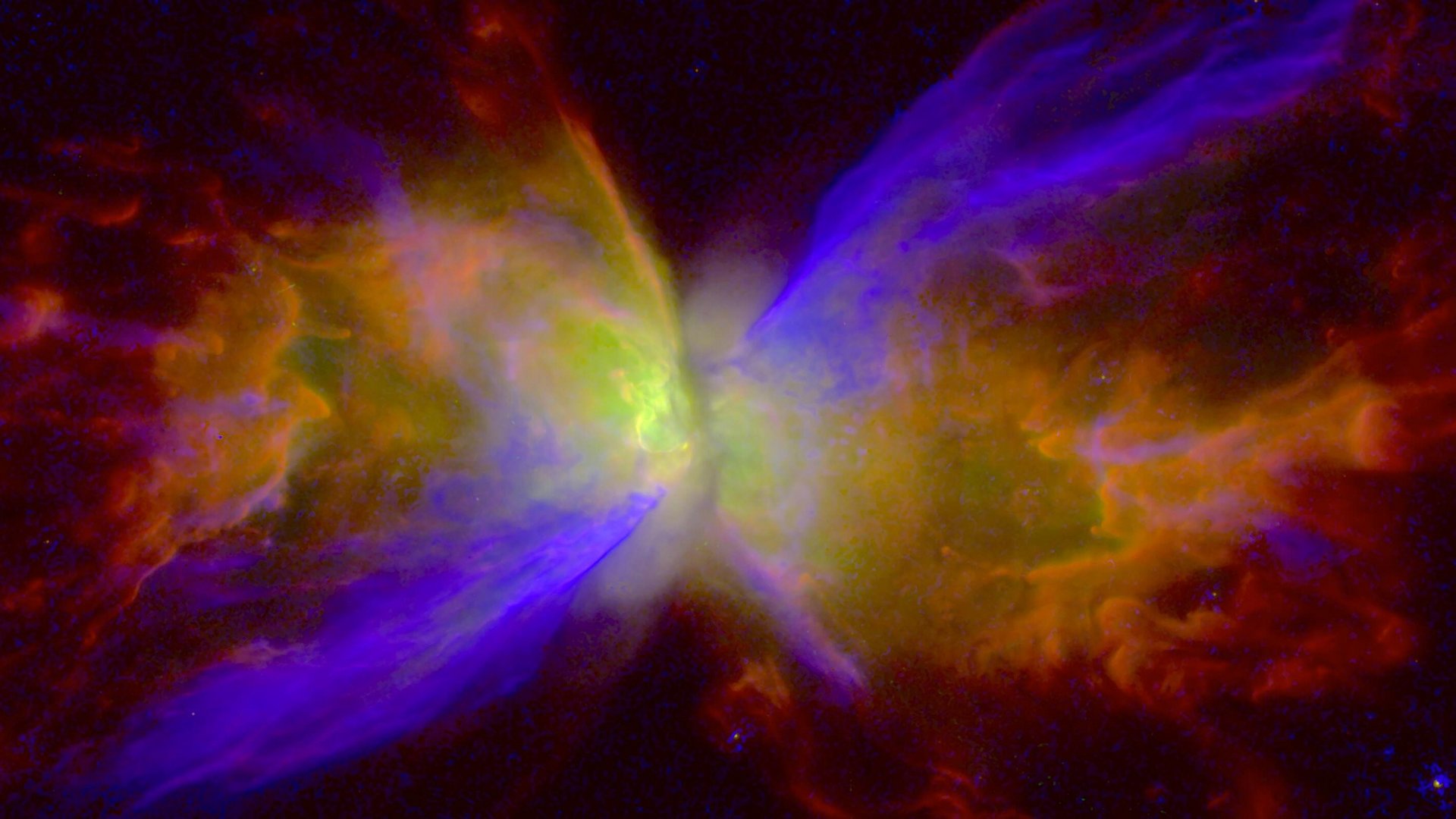 Wie aber kam der Käfer-Nebel zu seinen Flügeln? Astronominnen und Astronomen vermuten, dass sich im Zentrum solcher Gaswolken nicht ein einzelner Stern, sondern ein Doppelstern befindet: also zwei Sterne, die sich gegenseitig umkreisen. Der zweite Stern verhindert mit seiner Schwerkraft teilweise, dass sich das Gas ausbreitet, und sorgt so für die besondere Form des Nebels.