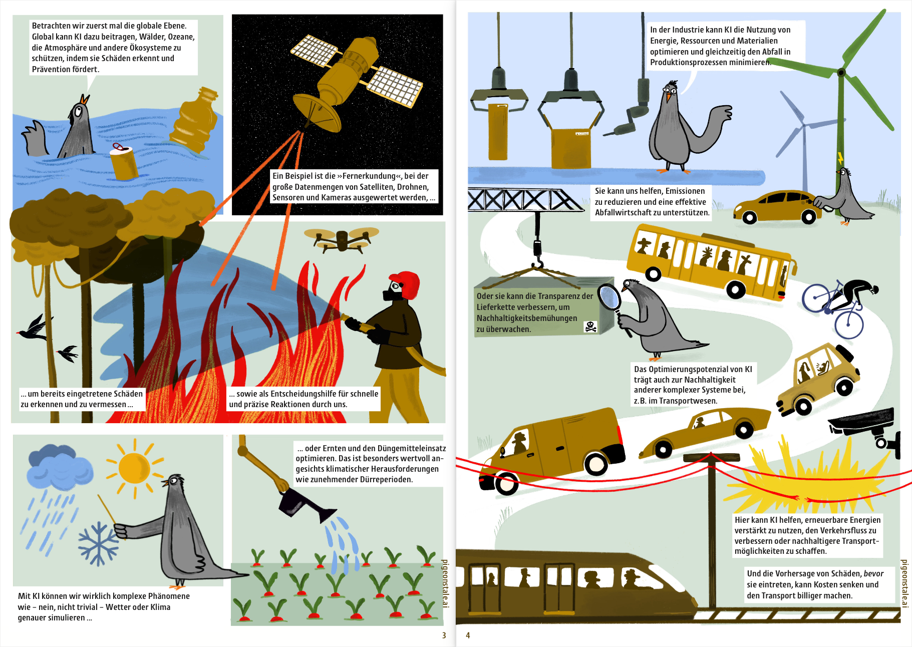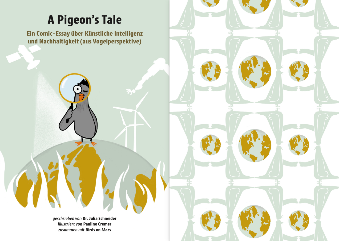 Begleiten Sie die Taube in eine illustrierte Welt, in der künstliche Intelligenz auf Nachhaltigkeit trifft. Der Comic-Essay „A Pigeon's Tale“ bietet einen Überblick über die Dimensionen und Anwendungsmöglichkeiten von KI, ihre Grenzen und ethische Überlegungen bezüglich ökologischer Nachhaltigkeit.