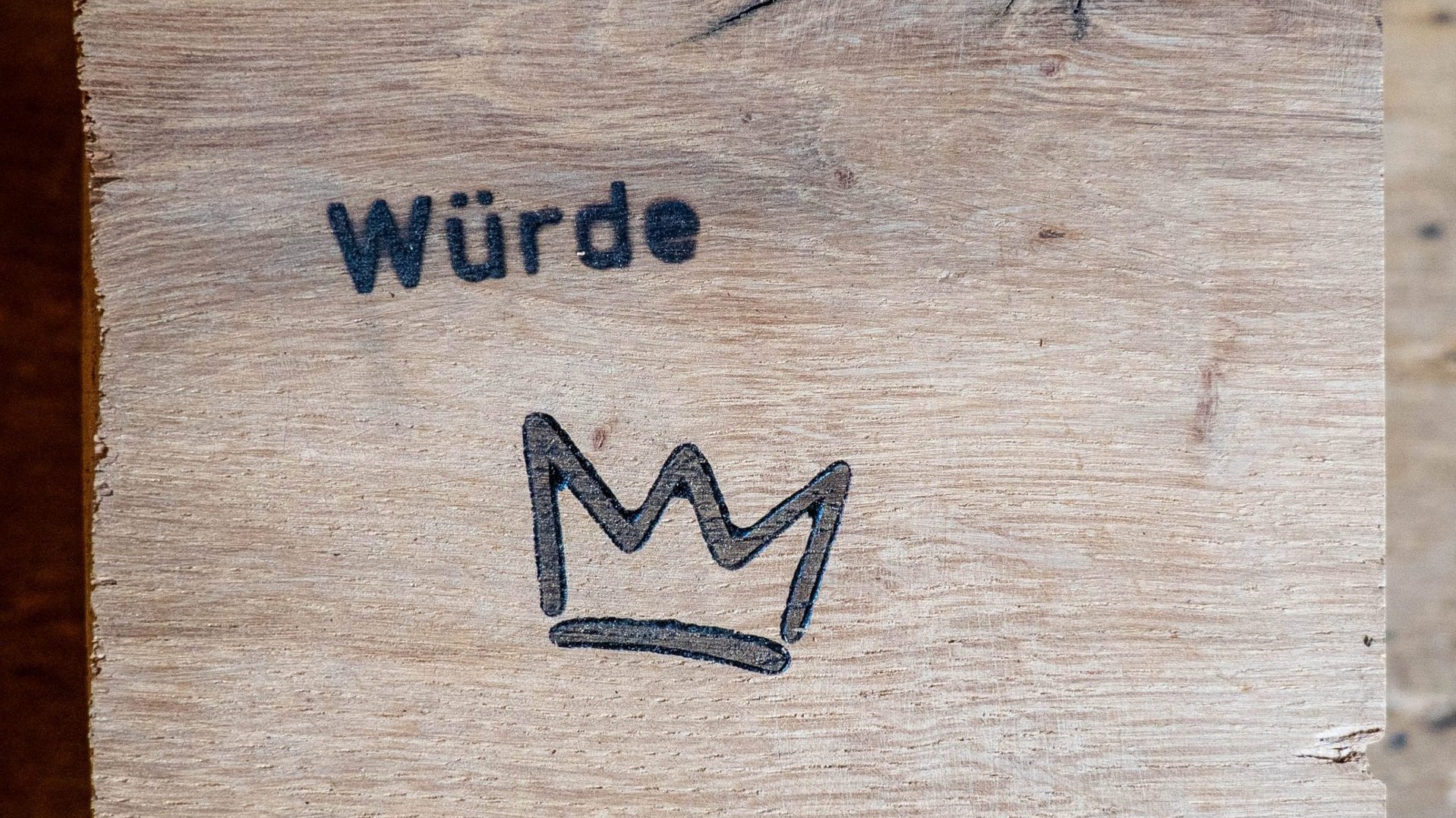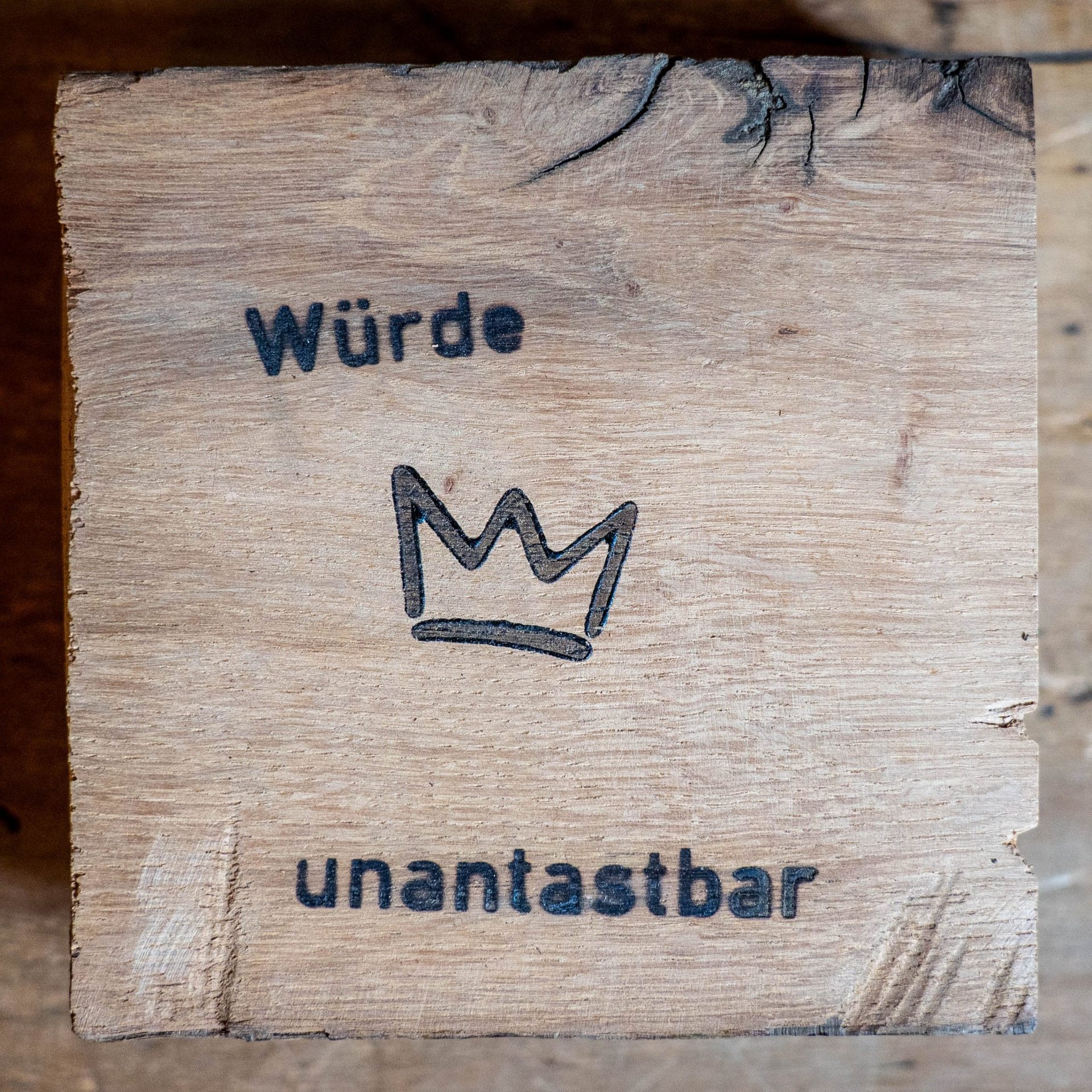 Diakon Knoblauch: „Würde – unantastbar“ ist aus der Idee entstanden, in diesem besonderen Jahr 2024 ein deutliches Zeichen für Menschenwürde und Demokratie zu setzen. Dazu brennen wir die Worte „Würde“ und „unantastbar“ in Holztafeln ein mit der Überzeugung: Sie ist unauslöschlich, alternativlos und sichtbar. Dann verteilen wir die Würdetäfelchen in ganz Deutschland. Sie mögen den Menschen in den unterschiedlichsten Kontexten spiegeln: Jeder Mensch hat Würde. Jeder Mensch ist ein königlicher Mensch. Jeder ein König, jede eine Königin. Deswegen ist auf den Täfelchen immer auch eine Krone eingebrannt. Sie sollen sich an möglichst vielen Orten verbreiten und zur Diskussion anregen.
