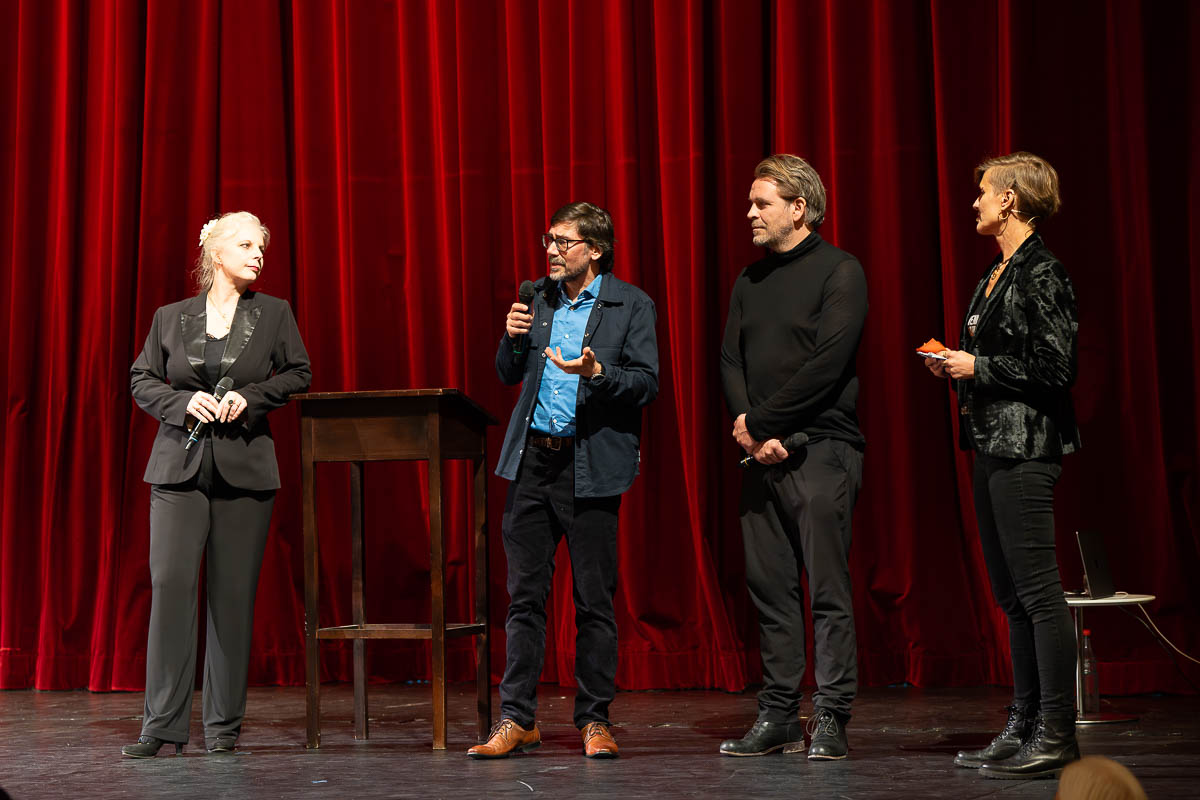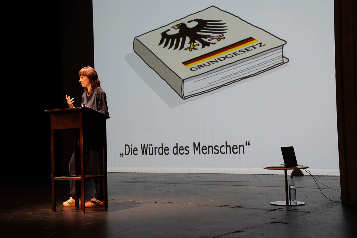 Dass diese Mühsal aber möglichweise alternativlos ist, verdeutlichten die eindrucksvollen Beiträge der Schauspielerin Sophie Bock vom Cottbuser Ensemble, die unter anderem aus den Schriften der kanadischen Schriftstellerin und Frauenrechtlerin Margaret Atwood zitierte und mahnende dystopische Bilder jenseits von Demokratie zeichnete.