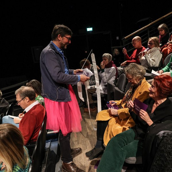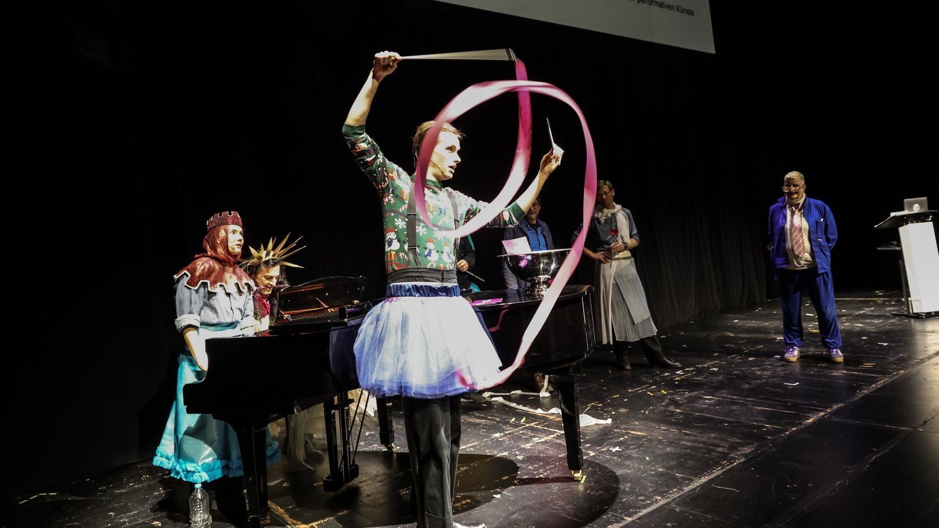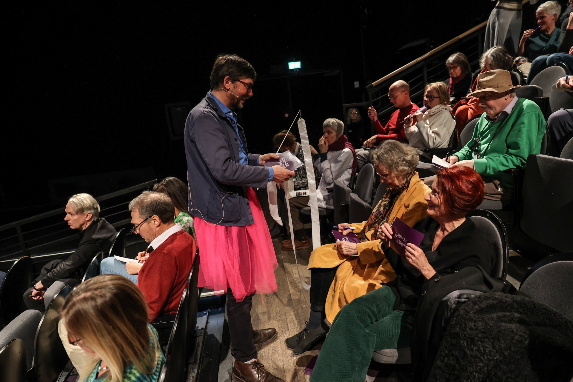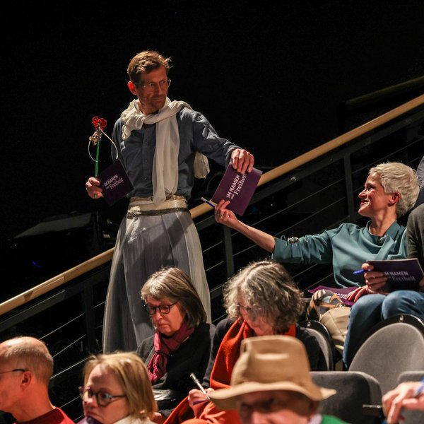 Bei ihrer performativen Lesung wurde Sibylle Peters von den Schauspielerinnen und Schauspielern Blanka Winkler, Kilian Ponert und Mila Moinzadeh aus dem Ensemble des Düsseldorfer Schauspielhauses begleitet. Als Feen verkleidet unterstützten außerdem Henrik Adler, Uwe Gössel und Thorsten Logge vom Projektteam „Im Namen der Freiheit“ die partizipative Wünschesammlung.