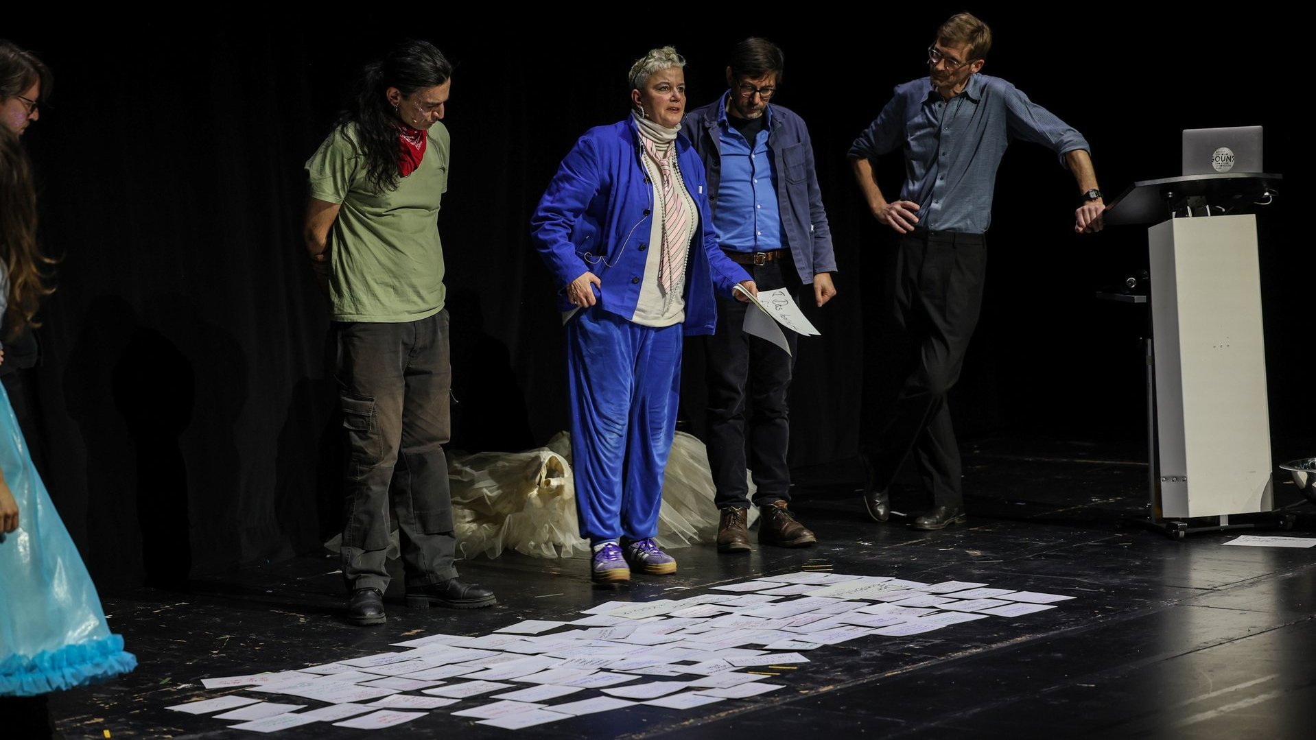 Nach diesem Modell konnten auch die Zuschauerinnen und Zuschauer im Düsseldorfer Schauspielhaus auf Karten notieren, was – nach ihren Wünschen – in 2025 bereits geschehen sein sollte.
