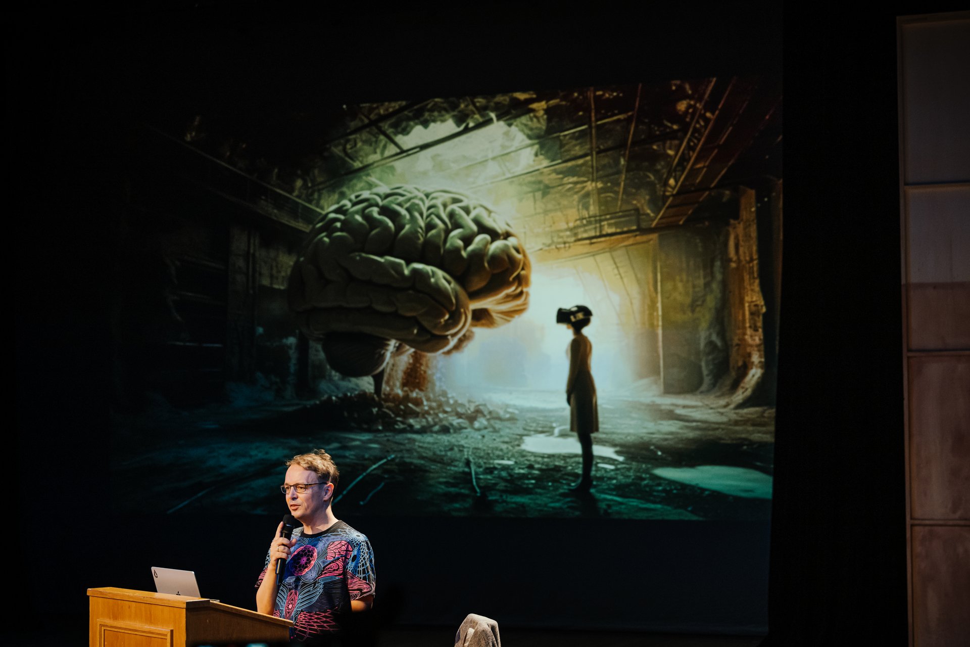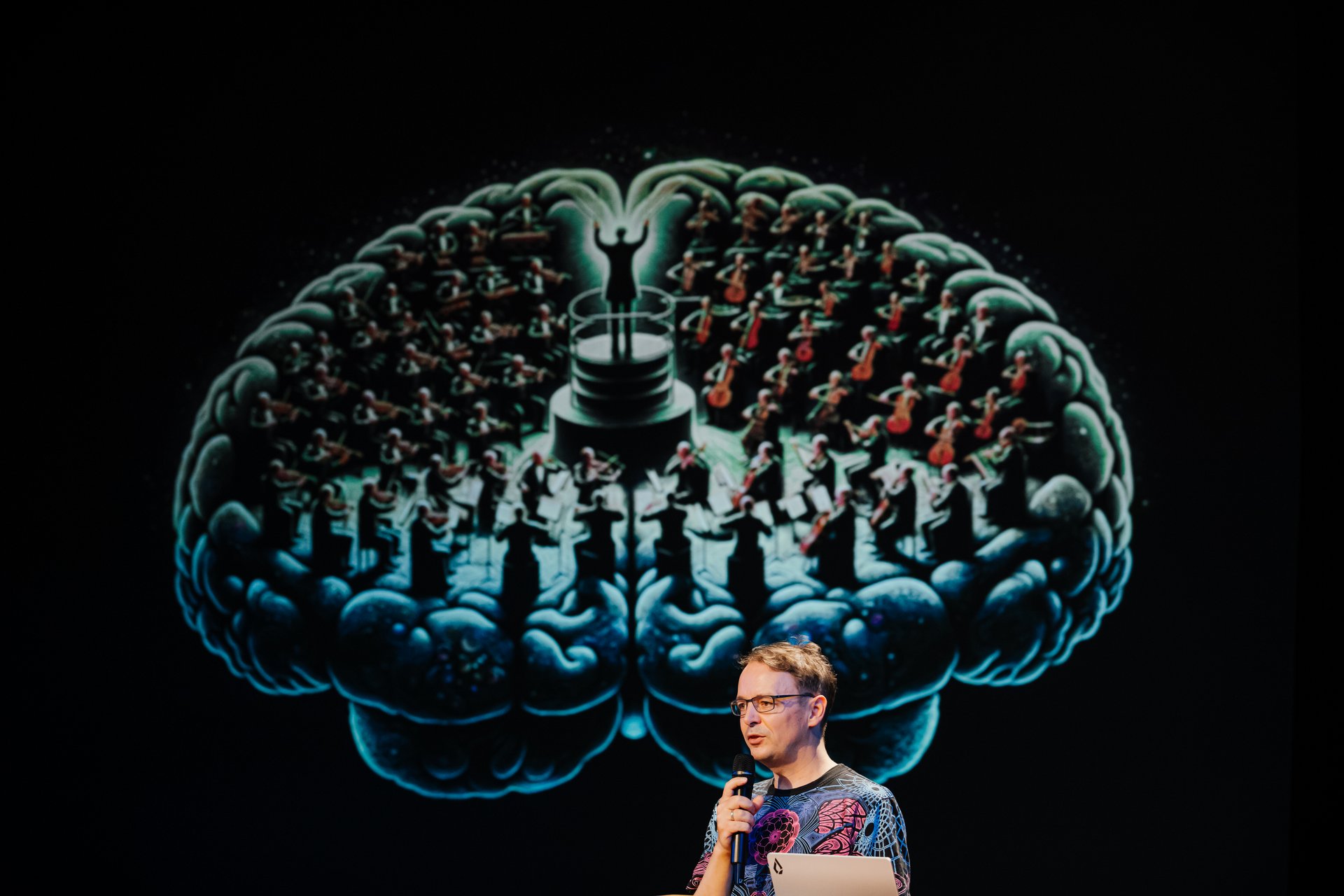 Nach einem szenischen Auftakt von Katharina Brankatschk und Harald Höbinger, der den faustischen Konflikt um den Sinn der Wissenschaft als eine Frage von Konditionierung des Bewusstseins interpretierte, betrat der KI-Forscher Joscha Bach die Bühne und begeisterte das Publikum mit einem komplexen, 40-minütigen Vortrag, der die klare Unterscheidung zwischen Mensch und Maschine auf der Basis von Bewusstsein und Geist als einem agentischen Strukturprinzip schrittweise demontierte.