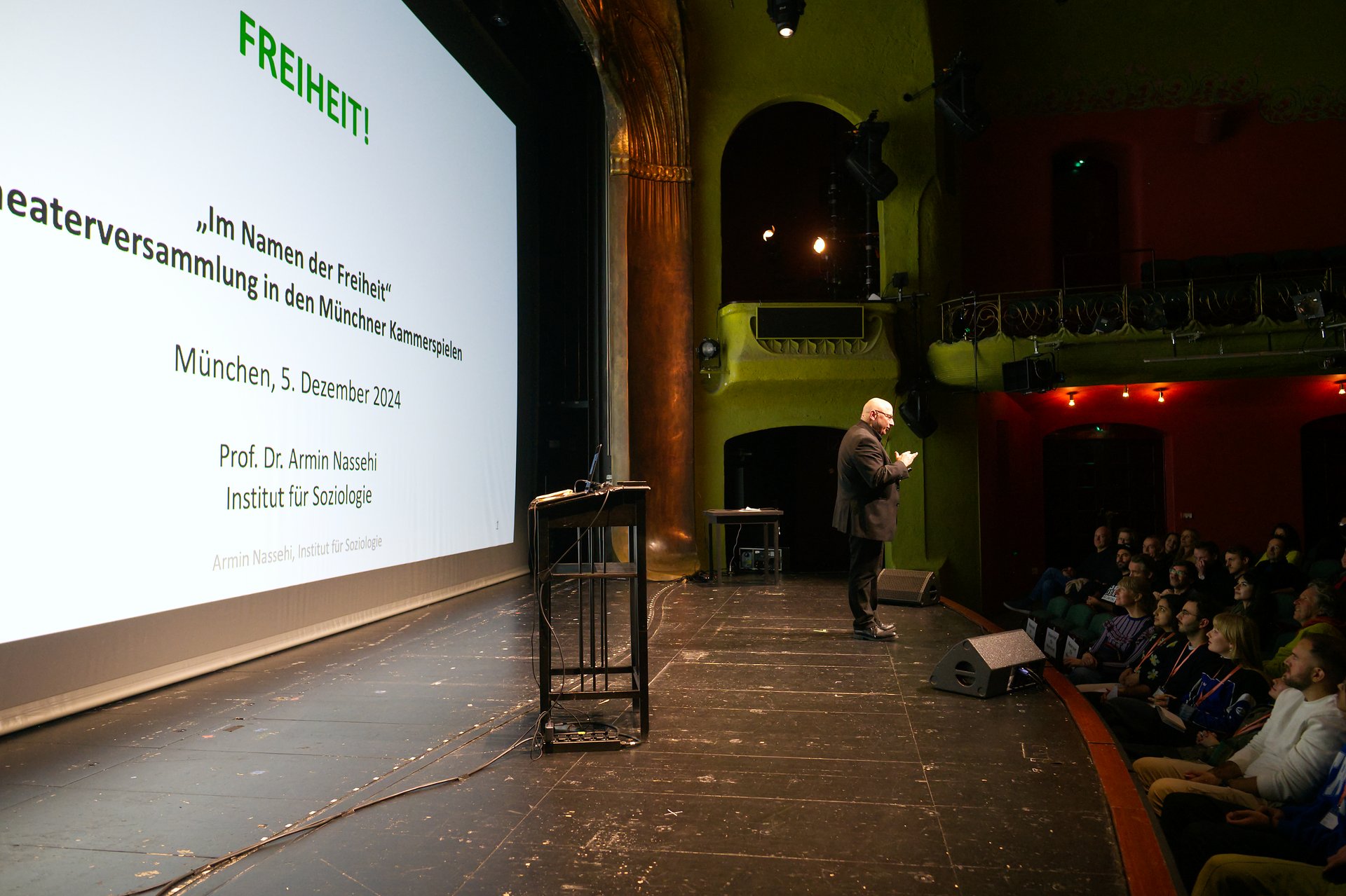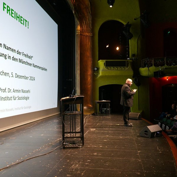 Wie frei sind wir? Und wer ist „wir“? Mit diesen beiden Fragen im Fokus fand die sechste Theaterversammlung des Projekts „Im Namen der Freiheit“ am 5. Dezember 2024 mit dem Soziologen Armin Nassehi und der Münchner Musikerin und Aktivistin Gündalein auf der großen Bühne der Münchner Kammerspiele statt.