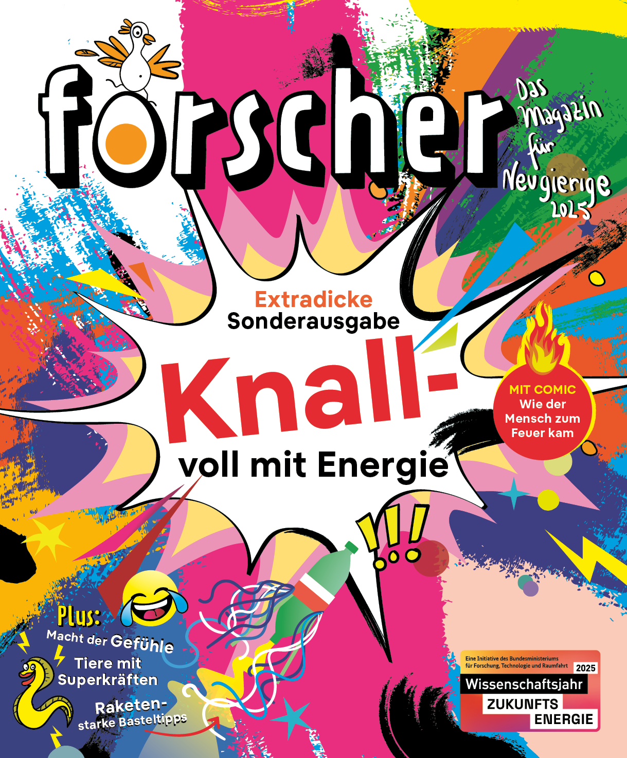 Begleite uns auf eine aufregende Reise in die Welt der Wissenschaft! Im forscher-Magazin erwarten dich spannende Geschichten, Bilder und Comics, Rätsel und Experimente.